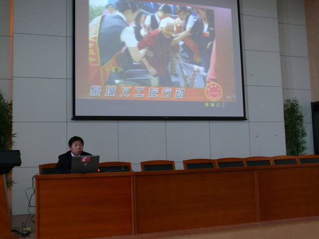 作为一名校友,赵言民首先回顾了自己在轻院学习的点点滴滴,并以自己的亲身经历鼓励大家珍惜大学时光,做好自己的知识储备,为将来在社会上发展打下坚实的基础。作为一名记者,作为“泉城义工”的骨干成员,赵言民用丰富的图片资料和精辟的言语,向与会的校友们介绍了自己的主要事迹:他组织发起的“为民工维权”特别行动,利用媒体的力量为民工讨回公道;汶川地震发生后,他又在第一时间内投入到抗震救灾中,组织号召广大泉城义工献血、捐款捐物,并带领志愿者赶赴抗震救灾第一现场,一边救灾一边发回最新的抗震救灾消息;面对者落水的七旬老人,他不畏艰险组织并参与营救,受到了社会的广泛赞誉。生动的事迹报告赢得了同学们的阵阵掌声,大家被赵言民校友的事迹深深感动。在报告的最后,赵言民校友表达了对母校的感恩的心,并鼓励同学们要奋发图强,今天以母校为荣,明天让母校以我为荣。