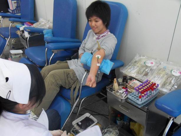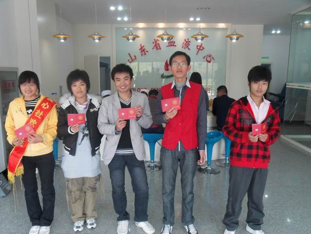 爱心社就无偿献血知识和血库现状向同学们做了宣传和介绍,并组织同学们到位于商业街的山东省血液中心爱心献血屋献血。在献血中心,爱心社的志愿者为参加献血的同学发放献血须知和献血登记表,并耐心地讲解关于献血的注意事项。献血中心井然有序,参与献血的同学在爱心社志愿者的指导下,按照步骤流程,登记,体检,有条不紊地进行着,默默地奉献着自己的爱心。一位同学拿着刚发下的献血证说:“原来献血也没那么可怕,这是我第一次献血,以后我会多参加无偿献血,奉献自己的一份爱心。”