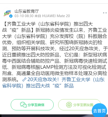 【教育厅官方微博】齐鲁工业大学(山东省科学院)推出四大战“疫”新品