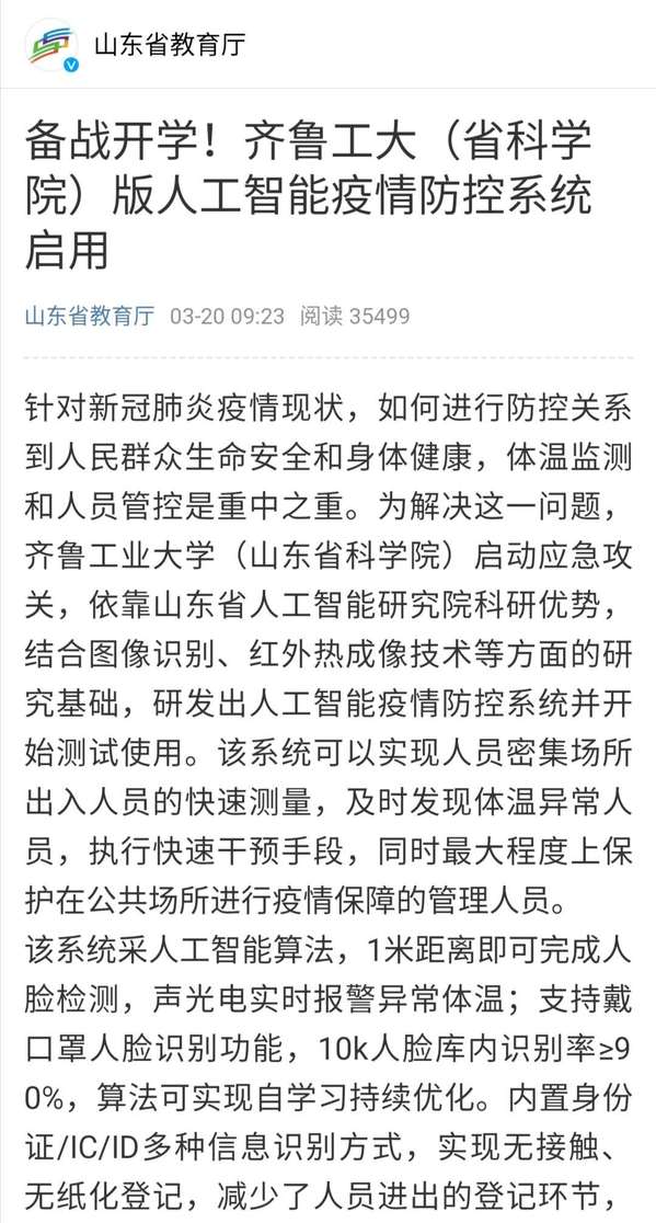 【教育厅官方微博】备战开学!齐鲁工大(省科学院)版人工智能疫情防控系统启用