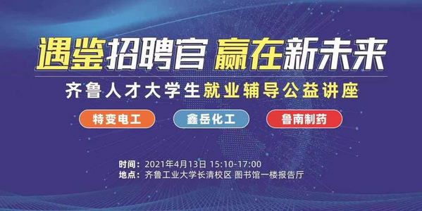 4月14日,“遇鉴招聘官,赢在新未来”大学生就业辅导公益讲座在齐鲁工业大学(山东省科学院)长清校区图书馆报告厅举办。特变电工山东鲁能泰山电缆有限公司人才招聘总监董慧、无棣鑫岳化工集团有限公司人力资源部主任李维功、鲁南制药集团招聘经理谭贤广做就业辅导主题分享,学生工作部(处)就业指导中心老师,200余名学生参加了此次活动。