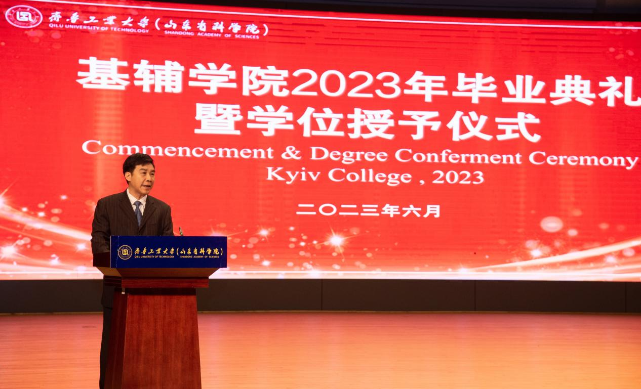 6月18日下午,齐鲁工业大学(山东省科学院)基辅学院2023年毕业典礼暨学位授予仪式在长清校区艺体中心礼堂隆重举行。基辅国立工艺设计大学校长伊万,校(院)领导吴衍涛、曹茂永、乔丙武、刘玉,相关部门负责人,基辅学院2023年毕业生、毕业生家长代表及学院全体教职工参加仪式。典礼由基辅学院党委书记陈国兴主持。