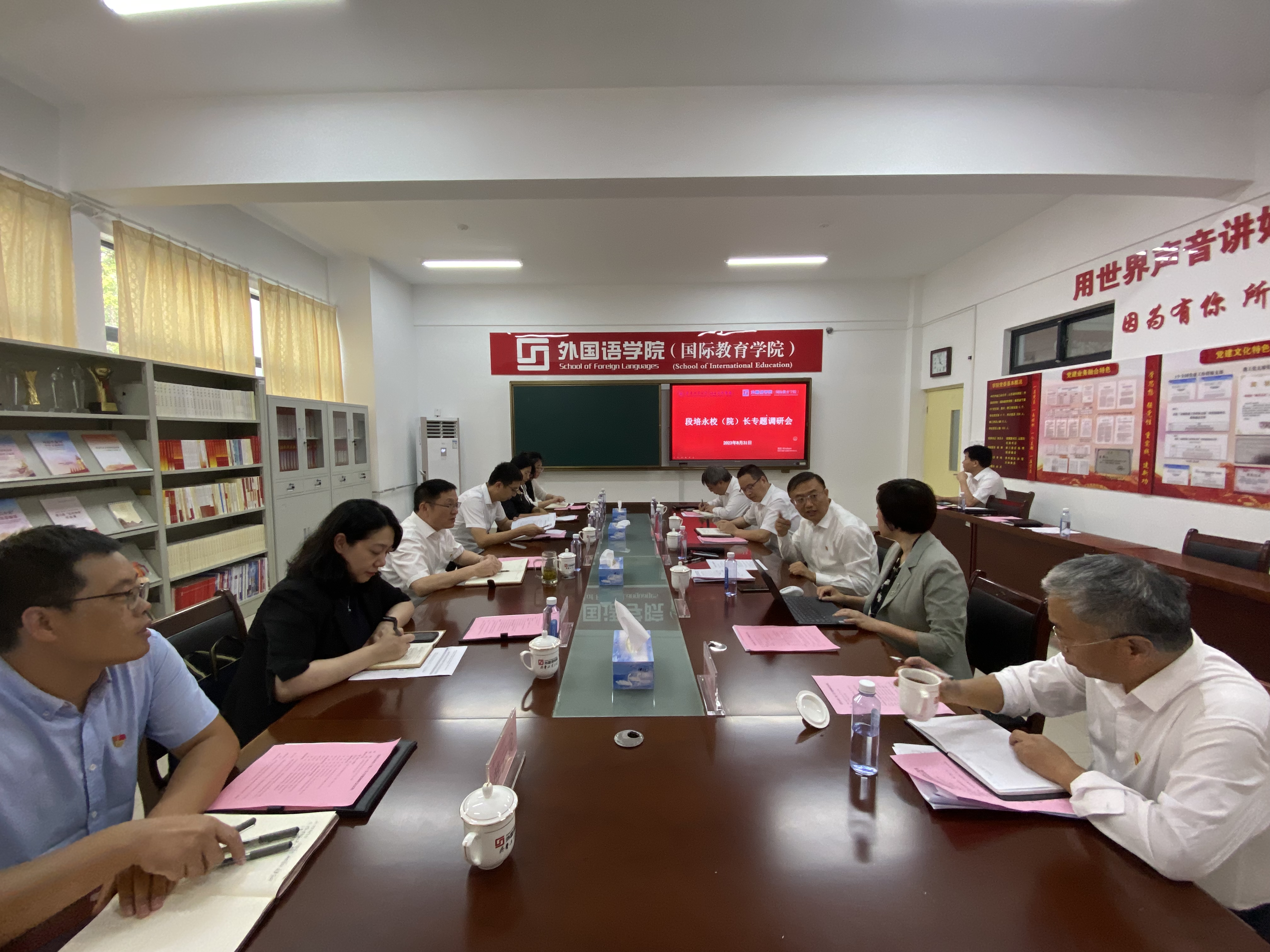 8月31日,齐鲁工业大学(山东省科学院)校(院)长段培永一行到外国语学院(国际教育学院)调研指导工作。党委办公室、发规处、人事处、教务处等部门负责同志陪同调研,外国语学院(国际教育学院)领导班子成员参加活动。
