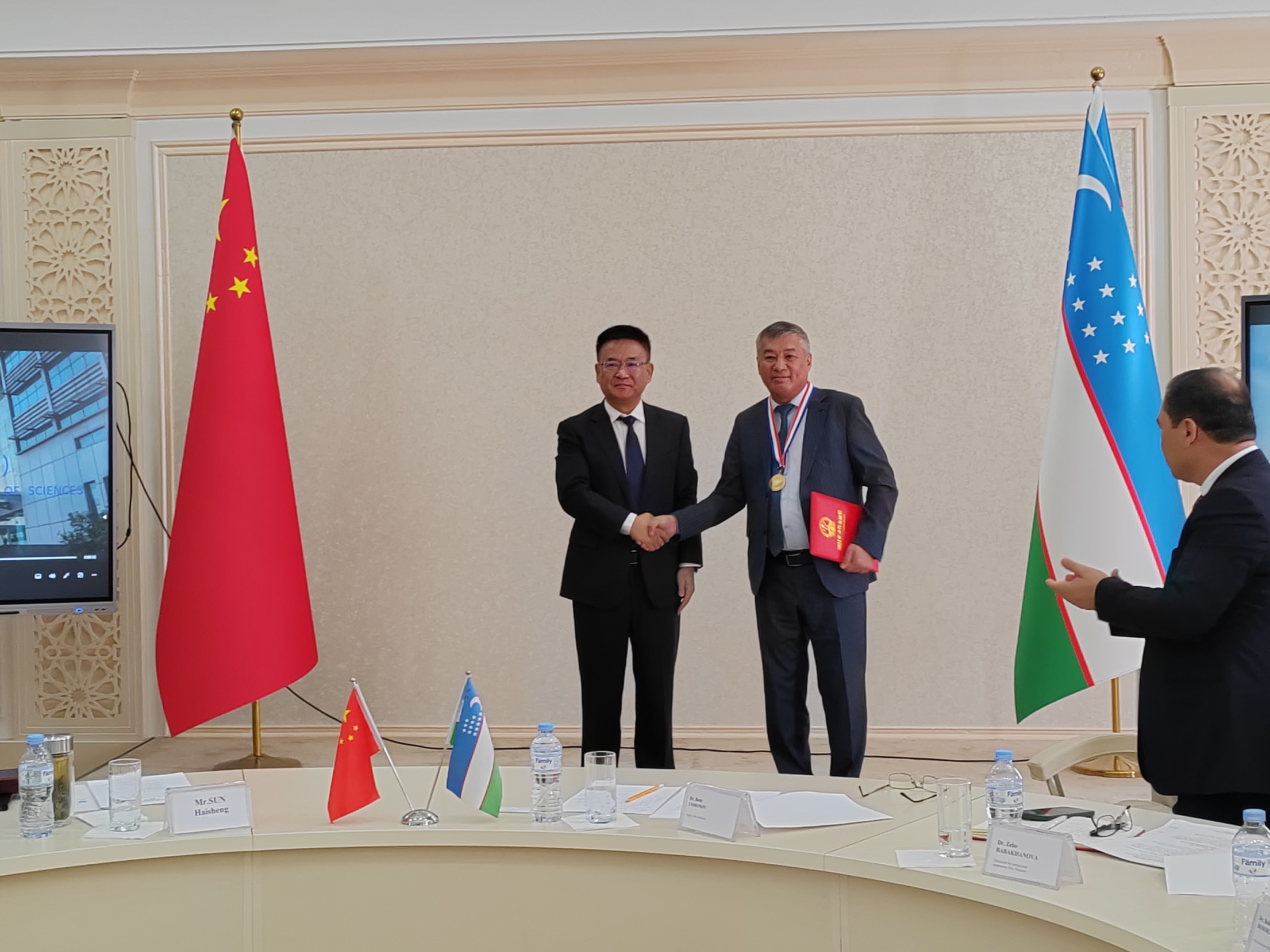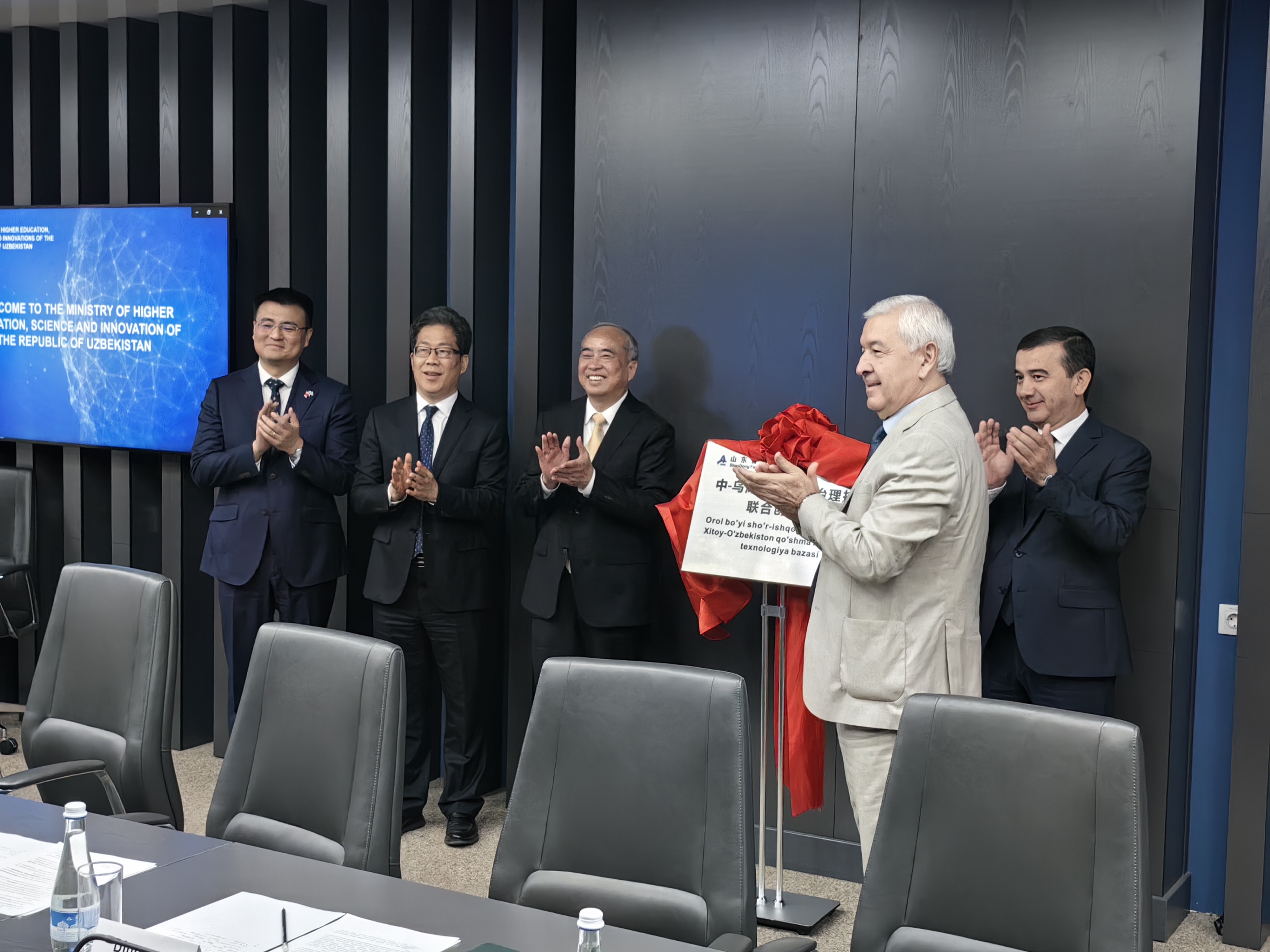 访问乌兹别克斯坦高等教育、科学与创新部期间,王英龙与乌兹别克斯坦国家科学院副院长巴赫提亚·埃博拉格诺夫共同为“中—乌咸海盐碱地治理技术联合创新基地”揭牌,省委书记林武、中国驻乌兹别克斯坦大使于骏和乌兹别克斯坦国家高等教育、科学和创新部副部长如霍诺夫·萨瓦洪共同见证。