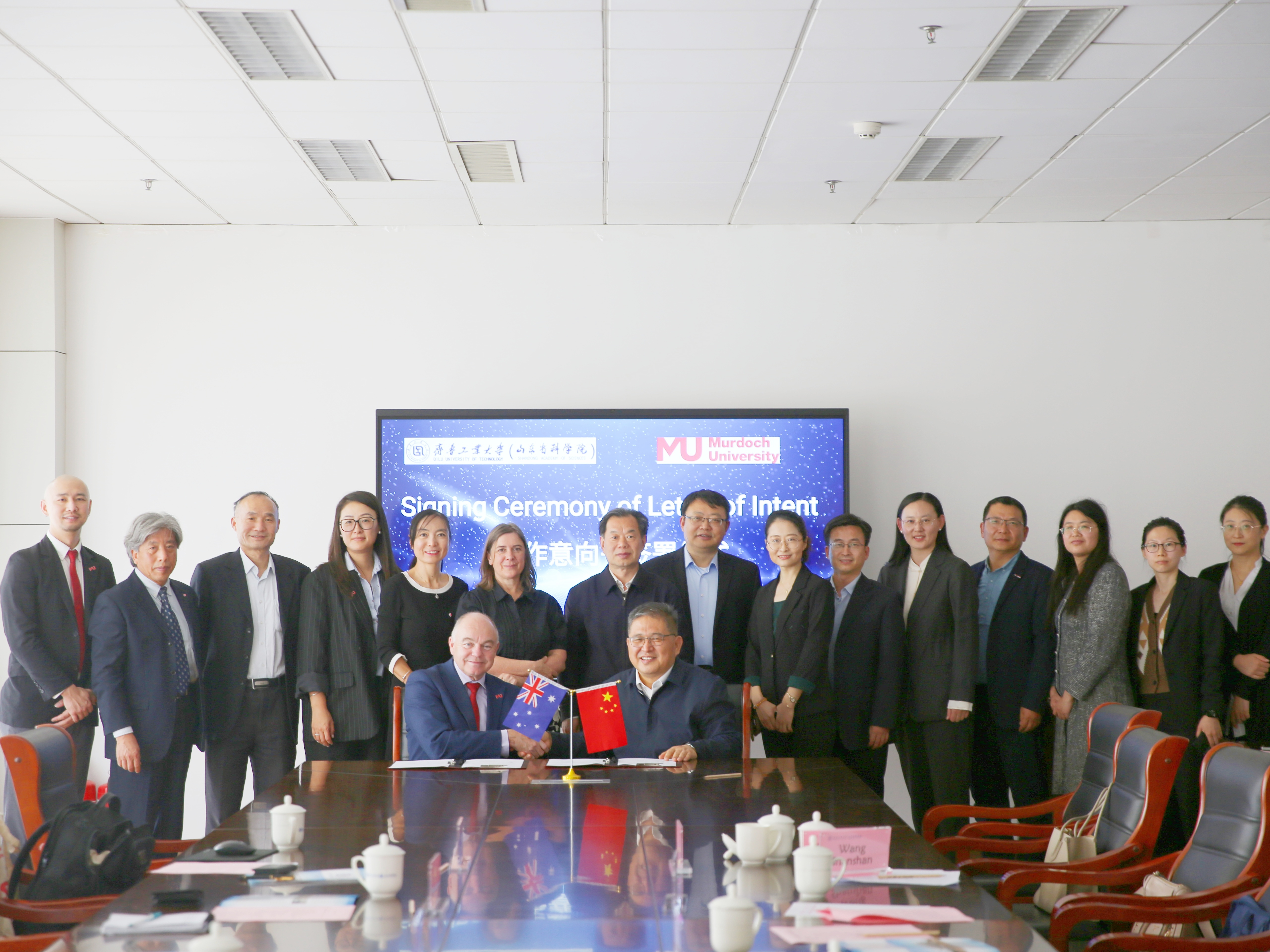 会上,吴衍涛与安德鲁·迪克斯分别代表齐鲁工业大学(山东省科学院)与莫道克大学签署合作意向书。