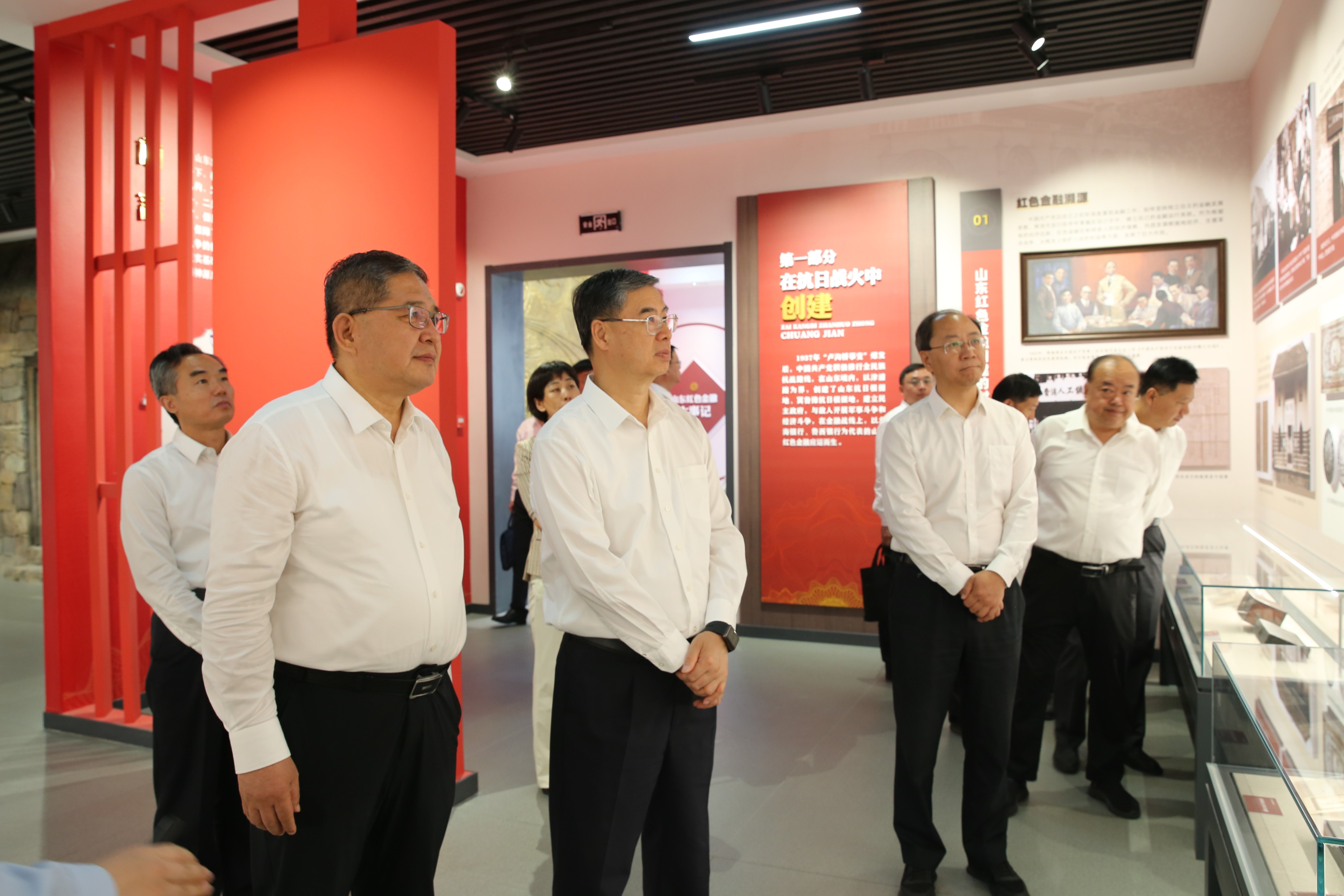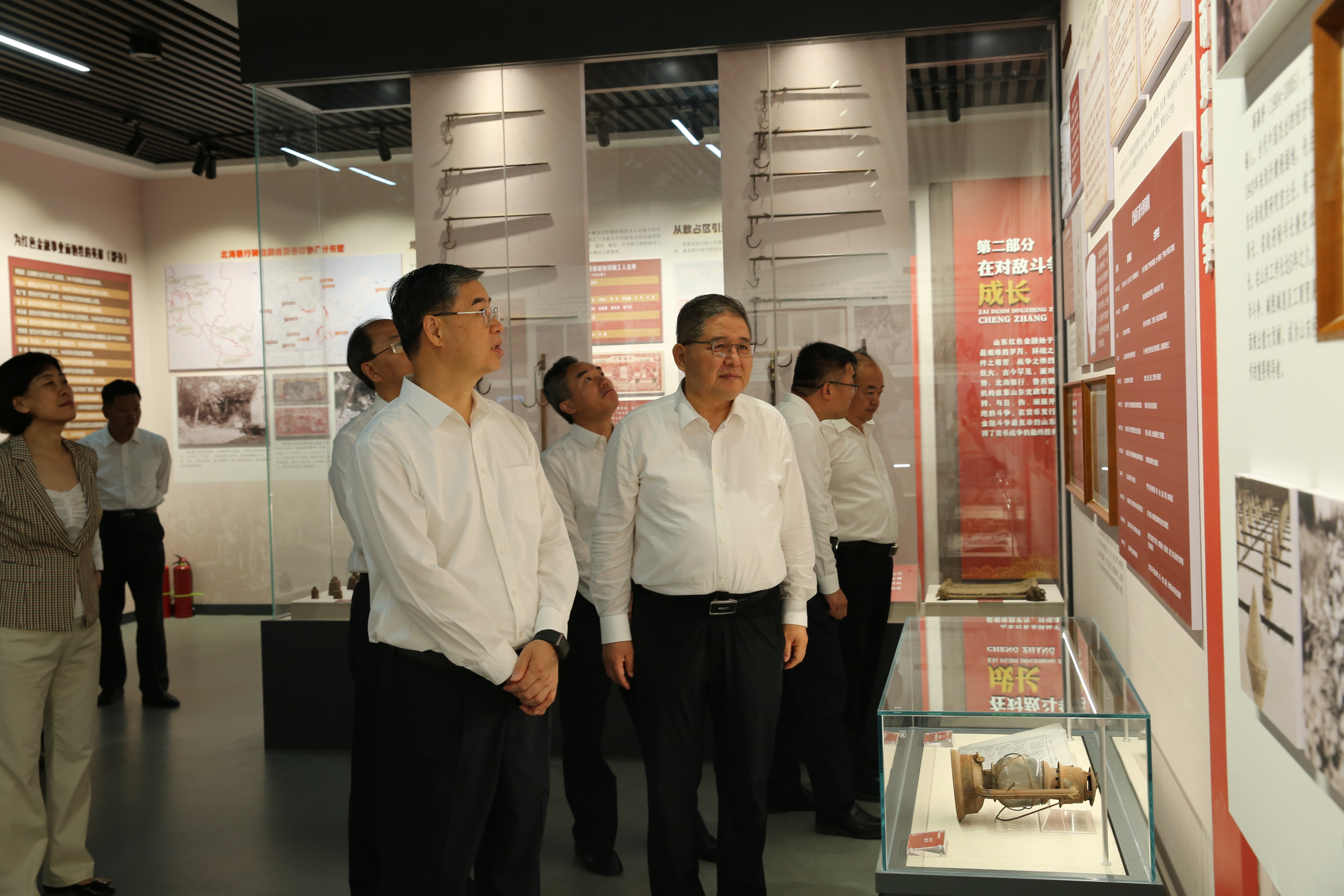 霍敏一行依次参观了“在抗日战火中创建”“在对敌斗争中成长”“在根据地建设中发挥作用”“在革命胜利中走向统一”四个展区,通过一幅幅珍贵的历史图片和一个个生动的红色故事,大家全面了解了山东红色金融从无到有、从弱到强的发展历程。
