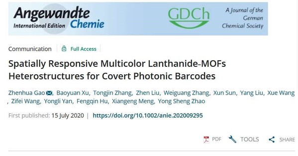 近日,齐鲁工业大学材料科学与工程学院山东省优势学科人才团队高振华副教授、孟宪赓教授与中科院化学研究所赵永生研究员合作,在国际顶级期刊《Angew. Chem. Int. Ed.》(中科院一区TOP,IF=12.95)上发表了题为“Spatially Responsive Multicolor Lanthanide-MOFs Heterostructures for Covert Photonic Barcodes”的最新研究成果。齐鲁工业大学(山东省科学院)为该工作的第一完成单位,孟宪赓、赵永生为该论文共同通讯作者,高振华为该论文的第一作者与通讯作者。