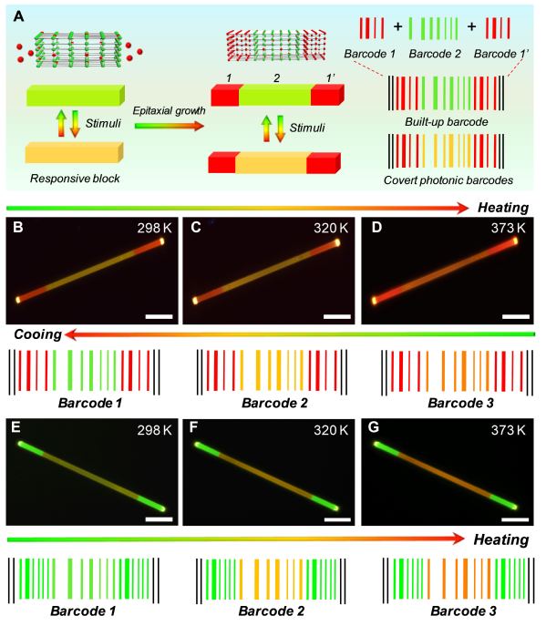 文章首次构筑了具有空间响应的镧系金属有机框架化合物(MOFs)微纳多色异质结构,利用异质外延的方法精准可控制备了多色复合一维镧系MOFs异质结,不同异质区域展现出的不同的发光特征以及镧系离子特有的锐利发射峰构成了MOFs异质结构的指纹信息。创新性的对这些易于分辨光谱进行编码,从而更自动、方便地识别该微纳结构。通过进一步热刺激调控异质区域中不同镧系离子之间的能量转移过程,对每个异质模块的发光颜色进行独立有效控制,首次实现了具有空间响应的多色微纳异质结构。这种独特的空间智能响应性可以进一步设计隐藏性的光子学条形码,在安全标签防伪领域具有巨大的应用潜力。